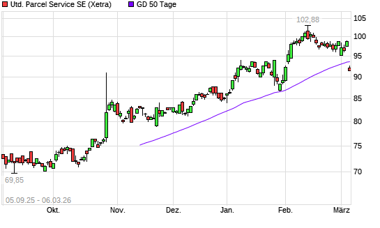 Mit dem Rücksetzer auf 89,65 EUR hat die UPS-Aktie am 05.03.2026 die 50-Tage-Linie nach unten gekreuzt.Die UPS-Aktie befindet sich seit dem 10.12.2025 im langfristigen ...weiterlesen