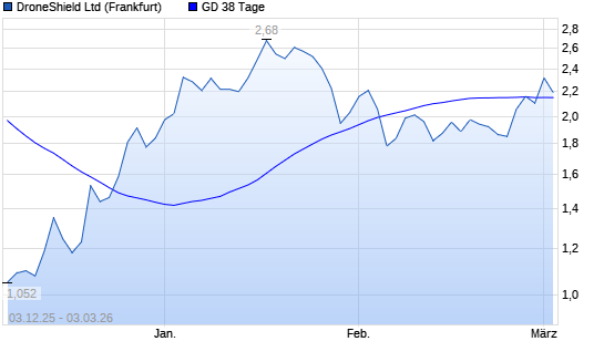 Mit dem Anstieg auf 2,32 EUR hat die DroneShield-Aktie am 02.03.2026 die 38-Tage-Linie nach oben gekreuzt.Die DroneShield-Aktie befindet sich seit dem 19.12.2025 im ...weiterlesen