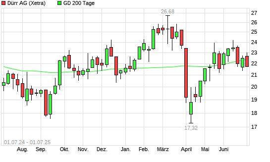 Mit dem Rücksetzer auf 22,30 EUR hat die Dürr-Aktie am 30.06.2025 die 200-Tage-Linie nach unten gekreuzt.Die Dürr-Aktie befand sich seit dem 27.06.2025 im langfristigen Aufwärtstrend ...weiterlesen
