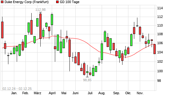 Mit dem Rücksetzer auf 105,72 EUR hat die Duke Energy-Aktie am 01.12.2025 die 100-Tage-Linie nach unten gekreuzt.Die Duke Energy-Aktie befindet sich seit dem 27.11.2025 im langfristigen ...weiterlesen