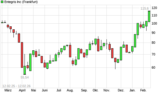 Mit dem Anstieg auf 115,60 EUR hat die ENTEGRIS-Aktie (ISIN US29362U1043) am 11.02.2026 ein neues 12-Monats-Hoch erreicht und damit den Kurs vom 10.02.2026 eingestellt.Die ...weiterlesen