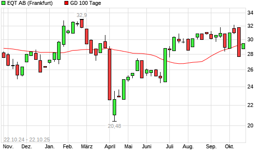 Mit dem Anstieg auf 29,31 EUR hat die EQT AB-Aktie am 21.10.2025 die 100-Tage-Linie nach oben gekreuzt.Die EQT AB-Aktie befindet sich seit dem 20.10.2025 im langfristigen Aufwärtstrend und hat ...weiterlesen