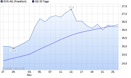 Mit dem Rücksetzer auf 26,20 EUR hat die EVN-Aktie am 25.11.2025 die 20-Tage-Linie nach unten gekreuzt.Die EVN-Aktie befindet sich seit dem 08.09.2025 im langfristigen Aufwärtstrend und ...weiterlesen