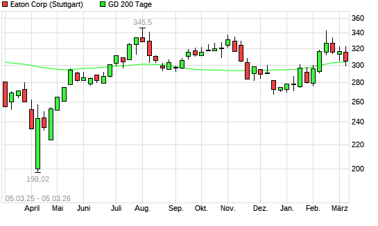 Mit dem Rücksetzer auf 302,25 EUR hat die Eaton-Aktie am 04.03.2026 die 200-Tage-Linie nach unten gekreuzt.Die Eaton-Aktie befand sich seit dem 03.02.2026 im ...weiterlesen