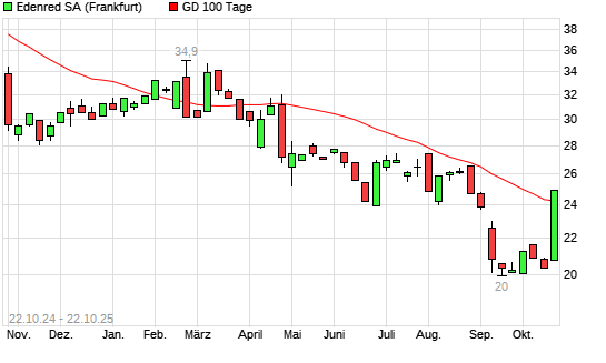 Mit dem Anstieg auf 24,69 EUR hat die Edenred-Aktie am 21.10.2025 die 100-Tage-Linie nach oben gekreuzt.Die Edenred-Aktie befindet sich seit dem 07.03.2025 im langfristigen Abwärtstrend und ...weiterlesen