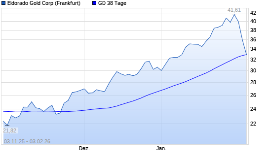 Mit dem Rücksetzer auf 32,94 EUR hat die Eldorado Gold-Aktie am 02.02.2026 die 38-Tage-Linie nach unten gekreuzt.Die Eldorado Gold-Aktie befindet sich seit dem 09.04.2025 im langfristigen ...weiterlesen