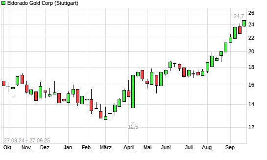 Mit dem Anstieg auf 24,80 EUR hat die Eldorado Gold-Aktie (ISIN CA2849025093) am 26.09.2025 ein neues 5-Jahres-Hoch erreicht und damit den Kurs vom 15.09.2025 eingestellt.Die ...weiterlesen