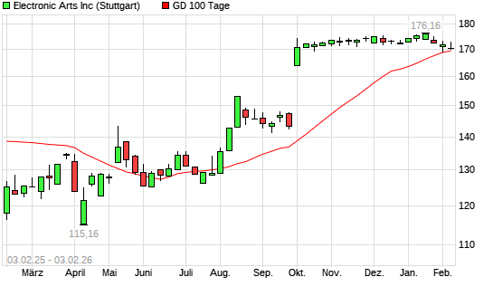 Mit dem Rücksetzer auf 170,38 EUR hat die Electronic Arts-Aktie am 02.02.2026 die 100-Tage-Linie nach unten gekreuzt.Die Electronic Arts-Aktie befindet sich seit dem 04.08.2025 ...weiterlesen