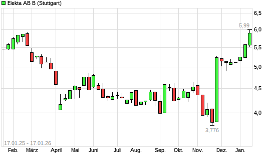 Mit dem Anstieg auf 5,80 EUR hat die Elekta B-Aktie (ISIN SE0000163628) am 16.01.2026 ein neues 6-Monats-Hoch erreicht und damit den Kurs vom 15.01.2026 eingestellt.Die Elekta B-Aktie befindet ...weiterlesen