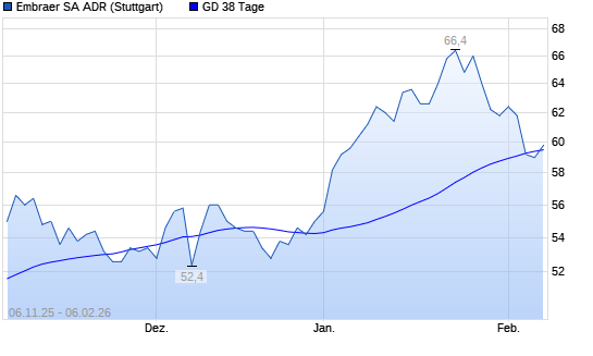 Mit dem Rücksetzer auf 58,40 EUR hat die Embraer SA ADR-Aktie am 05.02.2026 die 38-Tage-Linie nach unten gekreuzt.Die Embraer SA ADR-Aktie befindet sich seit dem 29.07.2025 ...weiterlesen