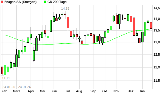 Mit dem Rücksetzer auf 13,54 EUR hat die Enagas-Aktie am 23.01.2026 die 200-Tage-Linie nach unten gekreuzt.Die Enagas-Aktie befand sich seit dem 22.01.2026 im langfristigen Aufwärtstrend ...weiterlesen