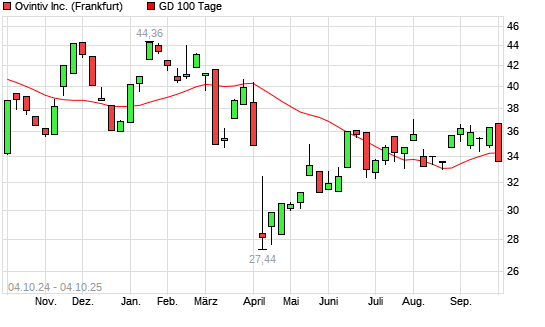 Mit dem Rücksetzer auf 33,58 EUR hat die Encana-Aktie am 03.10.2025 die 100-Tage-Linie nach unten gekreuzt.Die Encana-Aktie befindet sich seit dem 30.09.2025 im langfristigen Abwärtstrend ...weiterlesen