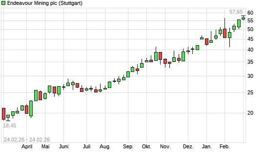 Mit dem Anstieg auf 57,00 EUR hat die Endeavour Mining-Aktie (ISIN GB00BL6K5J42) am 23.02.2026 ein neues 10-Jahres-Hoch erreicht und damit den Kurs vom 20.02.2026 eingestellt.Die ...weiterlesen