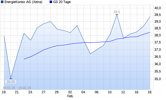 Mit dem Anstieg auf 39,65 EUR hat die Energiekontor-Aktie am 18.02.2026 die 20-Tage-Linie nach oben gekreuzt.Die Energiekontor-Aktie befindet sich seit dem 09.10.2025 im ...weiterlesen