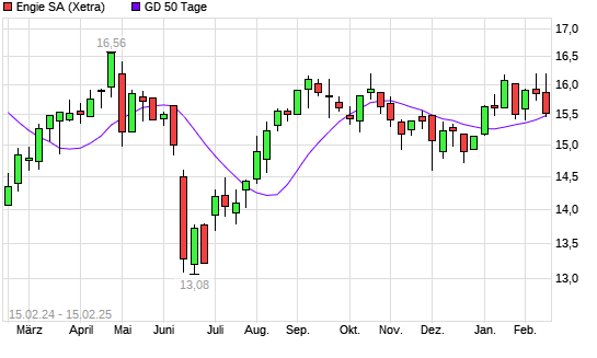 Mit dem Anstieg auf 15,52 EUR hat die Engie-Aktie am 14.02.2025 die 50-Tage-Linie nach oben gekreuzt.Die Engie-Aktie befindet sich seit dem 02.01.2025 im langfristigen Aufwärtstrend und hat ...weiterlesen