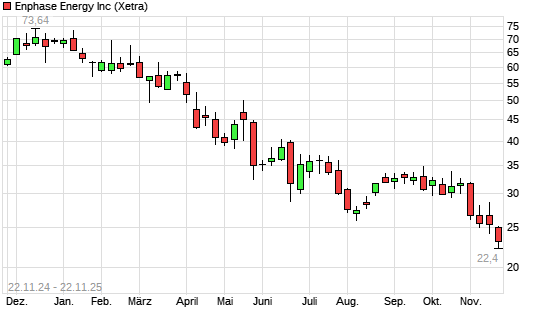 Mit dem Rücksetzer auf 22,61 EUR hat die Enphase Energy-Aktie (ISIN US29355A1079) am 21.11.2025 ein neues 5-Jahres-Tief erreicht und damit den Kurs vom 18.11.2025 eingestellt.Die Enphase ...weiterlesen