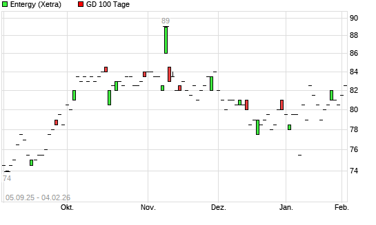 Mit dem Anstieg auf 80,00 EUR hat die Entergy-Aktie am 03.02.2026 die 100-Tage-Linie nach oben gekreuzt.Die Entergy-Aktie befindet sich seit dem 22.09.2025 im langfristigen Aufwärtstrend und ...weiterlesen