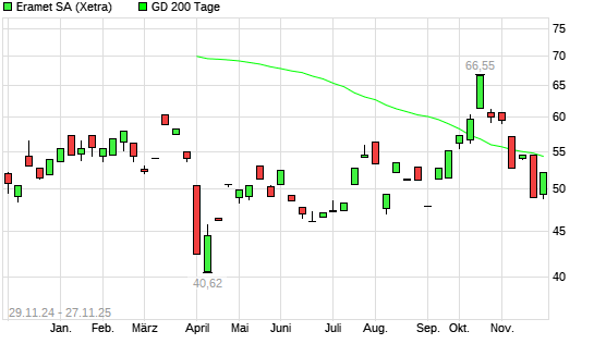 Mit dem Anstieg auf 52,10 EUR hat die Eramet-Aktie am 28.11.2025 die 200-Tage-Linie nach oben gekreuzt.Die Eramet-Aktie befand sich seit dem 21.11.2025 im langfristigen Abwärtstrend und hat ...weiterlesen