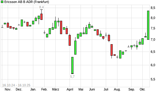 Mit dem Anstieg auf 8,35 EUR hat die Ericsson B ADR-Aktie (ISIN US2948216088) am 15.10.2025 ein neues 3-Jahres-Hoch erreicht und damit den Kurs vom 23.01.2025 eingestellt.Die Ericsson B ADR-Aktie ...weiterlesen