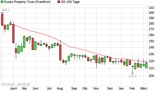 Mit dem Anstieg auf 219,70 EUR hat die Essex Property Trust-Aktie am 03.03.2026 die 100-Tage-Linie nach oben gekreuzt.Die Essex Property Trust-Aktie befindet sich seit dem 03.04.2025 ...weiterlesen