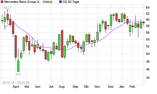 Mit dem Rücksetzer auf 58,70 EUR hat die Mercedes-Benz Group (ex Daimler)-Aktie am 27.02.2026 die 50-Tage-Linie nach unten gekreuzt.Die Mercedes-Benz Group (ex Daimler)-Aktie ...weiterlesen