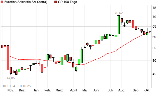 Mit dem Anstieg auf 62,68 EUR hat die Eurofins Scientific-Aktie am 09.10.2025 die 100-Tage-Linie nach oben gekreuzt.Die Eurofins Scientific-Aktie befindet sich seit dem 23.04.2025 im langfristigen ...weiterlesen