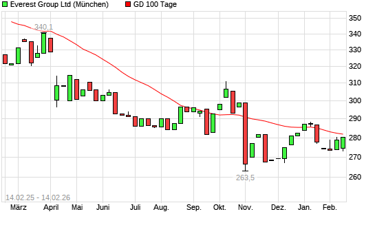 Mit dem Anstieg auf 281,90 EUR hat die Everest Re-Aktie am 13.02.2026 die 100-Tage-Linie nach oben gekreuzt.Die Everest Re-Aktie befindet sich seit dem 10.10.2025 im ...weiterlesen