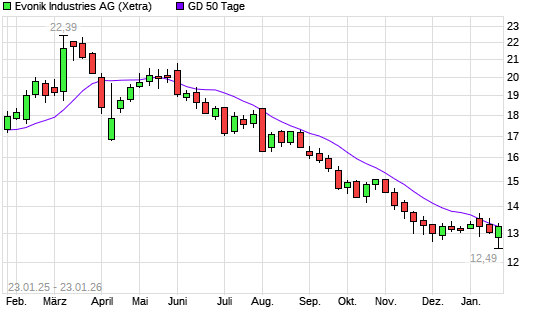 Mit dem Anstieg auf 13,20 EUR hat die Evonik Industries-Aktie am 22.01.2026 die 50-Tage-Linie nach oben gekreuzt.Die Evonik Industries-Aktie befindet sich seit dem 11.06.2025 ...weiterlesen