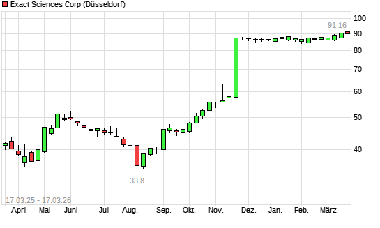 Mit dem Anstieg auf 90,42 EUR hat die Exact Sciences-Aktie (ISIN US30063P1057) am 16.03.2026 ein neues 12-Monats-Hoch erreicht und damit den Kurs vom 13.03.2026 eingestellt.Die ...weiterlesen