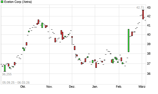 Mit dem Anstieg auf 42,22 EUR hat die Exelon-Aktie (ISIN US30161N1019) am 05.03.2026 ein neues 6-Monats-Hoch erreicht und damit den Kurs vom 03.03.2026 eingestellt.Die ...weiterlesen