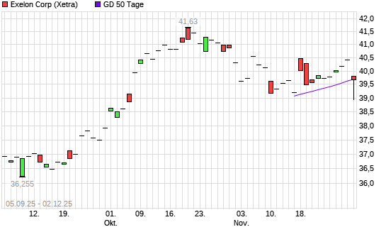 Mit dem Rücksetzer auf 39,57 EUR hat die Exelon-Aktie am 01.12.2025 die 50-Tage-Linie nach unten gekreuzt.Die Exelon-Aktie befindet sich seit dem 17.11.2025 im langfristigen Aufwärtstrend ...weiterlesen