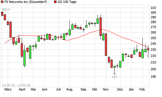 Mit dem Rücksetzer auf 219,40 EUR hat die F5 Networks-Aktie am 13.02.2026 die 100-Tage-Linie nach unten gekreuzt.Die F5 Networks-Aktie befindet sich seit dem 29.01.2026 im langfristigen ...weiterlesen