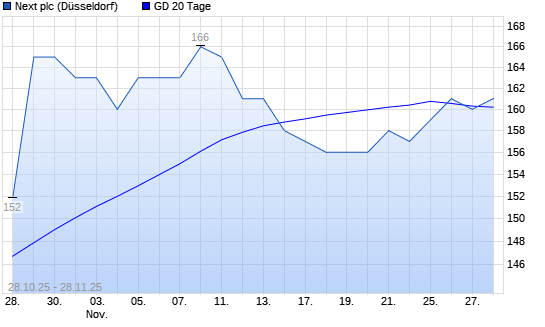 Mit dem Anstieg auf 162,00 EUR hat die Next-Aktie am 27.11.2025 die 20-Tage-Linie nach oben gekreuzt.Die Next-Aktie befindet sich seit dem 22.09.2025 im langfristigen Aufwärtstrend und hat in ...weiterlesen