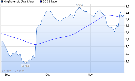 Mit dem Rücksetzer auf 3,43 EUR hat die Kingfisher-Aktie am 26.11.2025 die 38-Tage-Linie nach unten gekreuzt.Die Kingfisher-Aktie befindet sich seit dem 21.11.2025 im langfristigen Aufwärtstrend ...weiterlesen