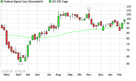 Mit dem Anstieg auf 93,50 EUR hat die Federal Signal Corporation-Aktie am 11.02.2026 die 200-Tage-Linie nach oben gekreuzt.Die Federal Signal Corporation-Aktie befand sich seit dem 23.01.2026 ...weiterlesen