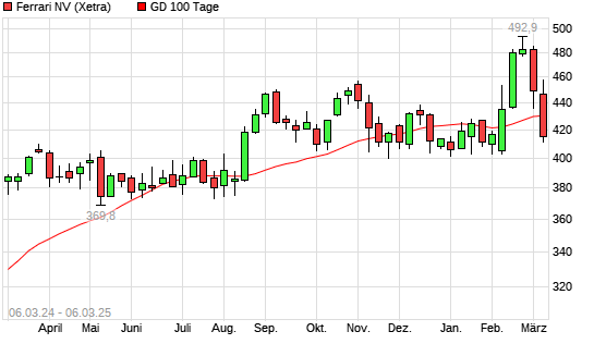 Mit dem Rücksetzer auf 428,20 EUR hat die Ferrari-Aktie am 05.03.2025 die 100-Tage-Linie nach unten gekreuzt.Die Ferrari-Aktie befindet sich seit dem 06.01.2025 im langfristigen Aufwärtstrend ...weiterlesen