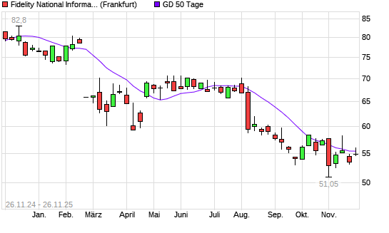 Mit dem Rücksetzer auf 54,82 EUR hat die Fidelity National Information Services-Aktie am 25.11.2025 die 50-Tage-Linie nach unten gekreuzt.Die Fidelity National Information Services-Aktie ...weiterlesen