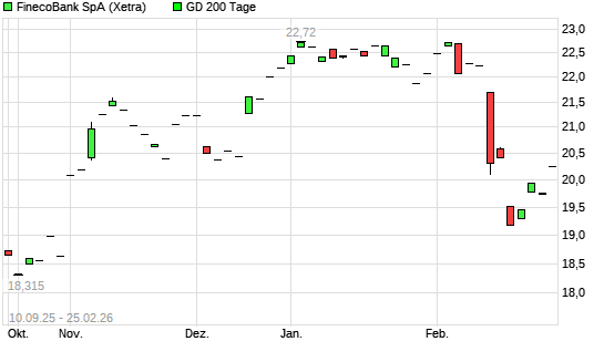 Mit dem Anstieg auf 20,31 EUR hat die FinecoBank-Aktie am 26.02.2026 die 200-Tage-Linie nach oben gekreuzt.Die FinecoBank-Aktie befand sich seit dem 20.02.2026 im ...weiterlesen