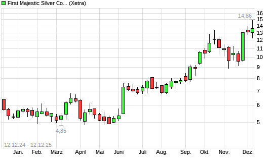 Mit dem Anstieg auf 14,43 EUR hat die First Majestic Silver-Aktie (ISIN CA32076V1031) am 11.12.2025 ein neues 3-Jahres-Hoch erreicht und damit den Kurs vom 03.12.2025 eingestellt.Die ...weiterlesen