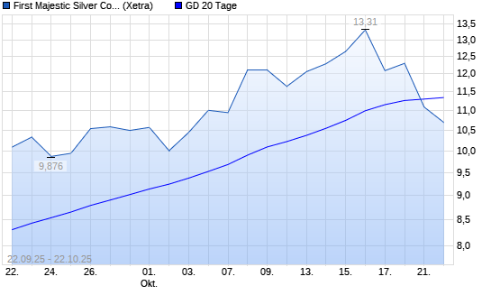 Mit dem Rücksetzer auf 10,94 EUR hat die First Majestic Silver-Aktie am 21.10.2025 die 20-Tage-Linie nach unten gekreuzt.Die First Majestic Silver-Aktie befindet sich seit ...weiterlesen