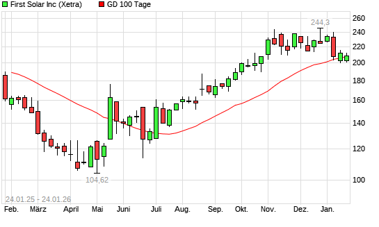 Mit dem Rücksetzer auf 204,95 EUR hat die First Solar-Aktie am 23.01.2026 die 100-Tage-Linie nach unten gekreuzt.Die First Solar-Aktie befindet sich seit dem 25.07.2025 im langfristigen ...weiterlesen
