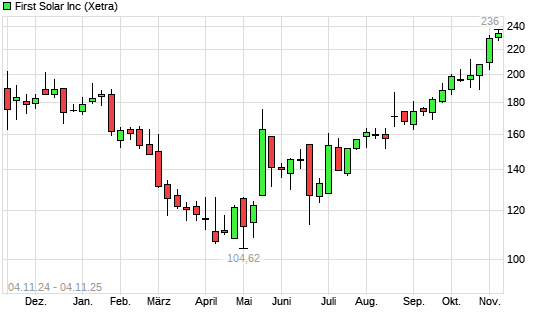 Mit dem Anstieg auf 232,00 EUR hat die First Solar-Aktie (ISIN US3364331070) am 03.11.2025 ein neues 12-Monats-Hoch erreicht und damit den Kurs vom 31.10.2025 eingestellt.Die First Solar-Aktie ...weiterlesen