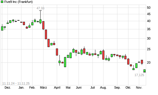 Mit dem Rücksetzer auf 17,21 EUR hat die Five9-Aktie (ISIN US3383071012) am 10.11.2025 ein neues 5-Jahres-Tief erreicht und damit den Kurs vom 13.10.2025 eingestellt.Die Five9-Aktie befindet ...weiterlesen