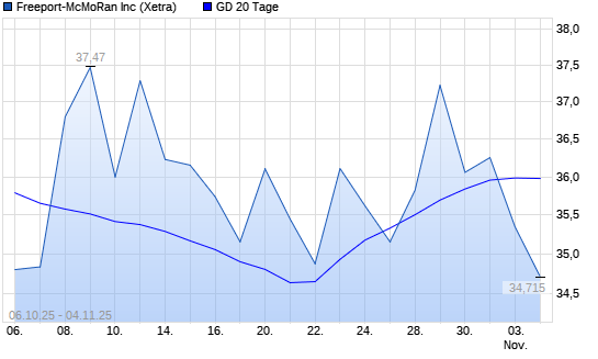 Mit dem Anstieg auf 36,23 EUR hat die Freeport-McMoran Copper-Aktie am 03.11.2025 die 20-Tage-Linie nach oben gekreuzt.Die Freeport-McMoran Copper-Aktie befindet sich seit dem 28.10.2025 im ...weiterlesen