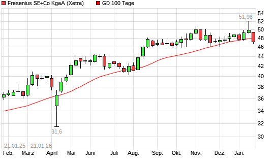 Mit dem Rücksetzer auf 47,16 EUR hat die Fresenius-Aktie am 20.01.2026 die 100-Tage-Linie nach unten gekreuzt.Die Fresenius-Aktie befindet sich seit dem 29.04.2024 im langfristigen Aufwärtstrend ...weiterlesen