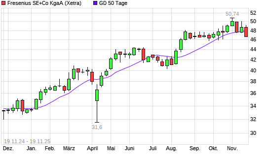 Mit dem Rücksetzer auf 47,41 EUR hat die Fresenius-Aktie am 18.11.2025 die 50-Tage-Linie nach unten gekreuzt.Die Fresenius-Aktie befindet sich seit dem 29.04.2024 im langfristigen Aufwärtstrend ...weiterlesen