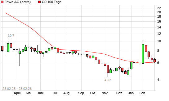 Mit dem Rücksetzer auf 5,75 EUR hat die Friwo-Aktie am 27.02.2026 die 100-Tage-Linie nach unten gekreuzt.Die Friwo-Aktie befindet sich seit dem 18.02.2026 im ...weiterlesen