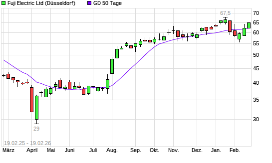 Mit dem Anstieg auf 65,00 EUR hat die Fuji Electric-Aktie am 18.02.2026 die 50-Tage-Linie nach oben gekreuzt.Die Fuji Electric-Aktie befindet sich seit dem 01.08.2025 im ...weiterlesen