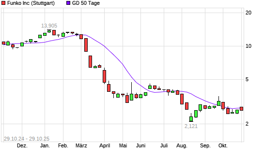 Mit dem Rücksetzer auf 2,66 EUR hat die Funko-Aktie am 28.10.2025 die 50-Tage-Linie nach unten gekreuzt.Die Funko-Aktie befindet sich seit dem 06.03.2025 im langfristigen Abwärtstrend und ...weiterlesen