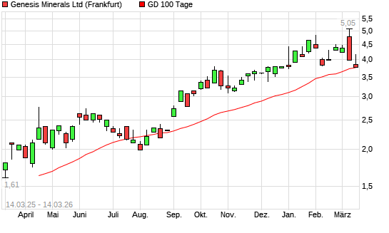 Mit dem Rücksetzer auf 3,78 EUR hat die GENESIS MINERALS-Aktie am 13.03.2026 die 100-Tage-Linie nach unten gekreuzt.Der Abstand zur 200-Tage-Linie beträgt aktuell +15,74%. ...weiterlesen